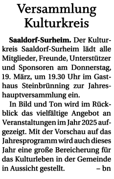 Umso schöner wäre es, wenn möglichst viele Mitglieder zur Jahreshauptversammlung kommen. Gemeinsam möchten wir anhand von Bildern und kurzen Texten auf die zahlreichen Veranstaltungen des Jahres 2025 zurückblicken und das vergangene Kulturjahr noch einmal lebendig werden lassen.