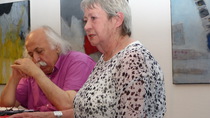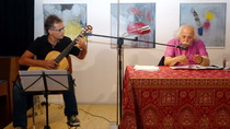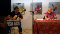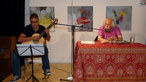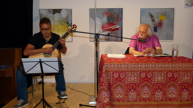 Nach der Pause durfte das Publikum den Lyriker Suleman Taufiq erleben, als er einige seiner berührenden und tiefgehenden Gedichte auf Deutsch und Arabisch vortrug. „Der Ängstliche lügt, leidet, schämt sich, schweigt, tötet“, mit diesem nachdenklich stimmenden Gedicht entließ der Schriftsteller seine Zuhörer in die Gesprächs- und Fragerunde. Dass er nicht zu den Ängstlichen gehört, sondern ein Mann der klaren und unmissverständlichen Worte ist, wurde in vielen seiner Einlassungen deutlich. So etwa, wenn er den türkischen Präsidenten Erdogan als „Verbrecher“ und „Faschist“ bezeichnet. „Der hat Syrien zerstört und er wird Europa zerstören.“ Auch zum Umgang mit syrischen Kriegsflüchtlingen bezog Taufiq eindeutig Stellung: „Ich habe großen Respekt vor der Willkommenskultur und der Hilfsbereitschaft der Deutschen. Es muss aber auch deutlich werden, dass bestimmte Werte und Regeln, die in diesem Land gelten, eingefordert werden müssen.“ Wie sich Syrier und Deutsche in Mentalität und Lebensform unterscheiden, wurde gefragt. Suleman Taufiq erklärte, dass in Syrien nicht so sehr das Individuum im Mittelpunkt stehe, sondern in erster Linie die Familie und die Gruppe. „Wenn die Menschen Probleme haben, gehen sie zu Verwandten und sprechen sich aus.“ Es waren viele Themen, die an diesem interessanten und erbaulichen Abend angesprochen wurden. Ein Abend, der sicherlich auch dazu beigetragen hat, Missverständnisse und Misstrauen zwischen den unterschiedlichen Kulturen abzubauen. Und ein Abend, der nicht nur durch den brillanten Erzähler Suleman Taufiq in Erinnerung bleiben wird, sondern auch durch die virtuos-dezenten Gitarren-Zwischenspiele von Max Reubel.