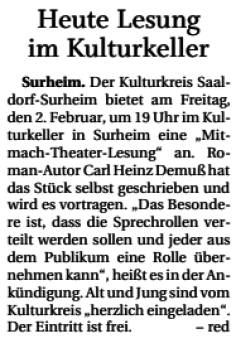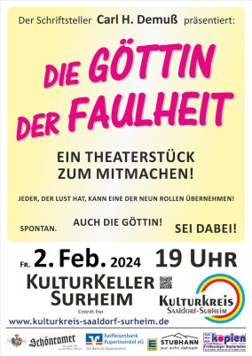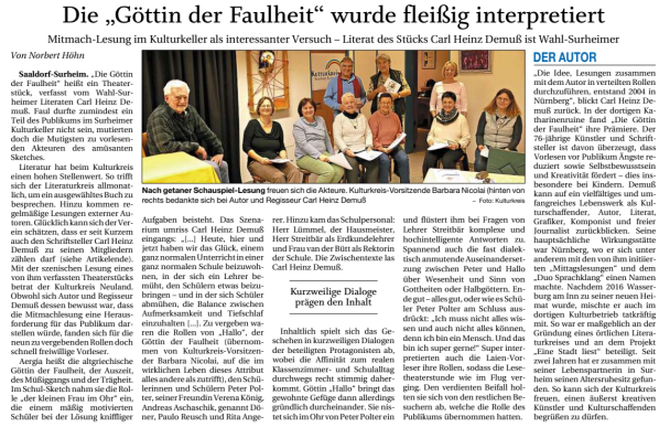 Die"Göttin der Faulheit" wurde fleißig interpretiert - Mitmach-Lesung i des Stücks Carl Heinz Demuß ist Wahl-Surheimerm Kulturkeller als interessanter Versuch - LiteratFreilassinger Anzeiger vom 08. Februar 2024