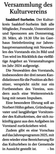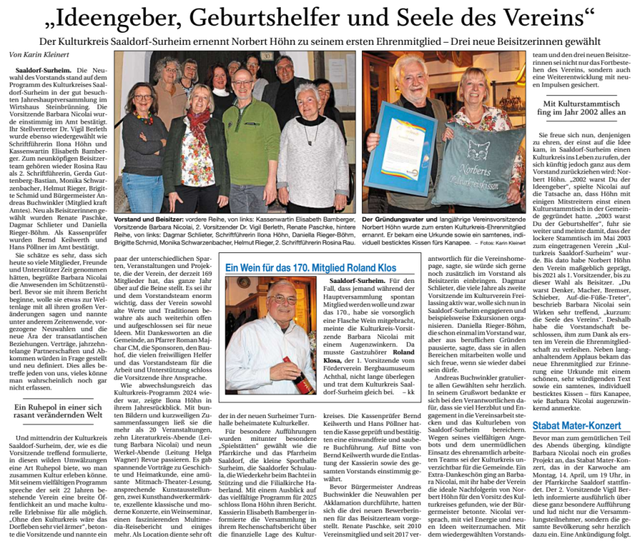 "Ideengeber, Geburtshelfer und Seele des Vereins" - Der Kulturkreis Saaldorf-Surheim ernennt Norbert Höhn zu seinem ersten Ehrenmitglied - Drei neue Beisitzerinnen gewählt Freilassinger Anzeiger vom 31. März 2025 FA_31032025.pdf PDF-Dokument [1.2 MB]